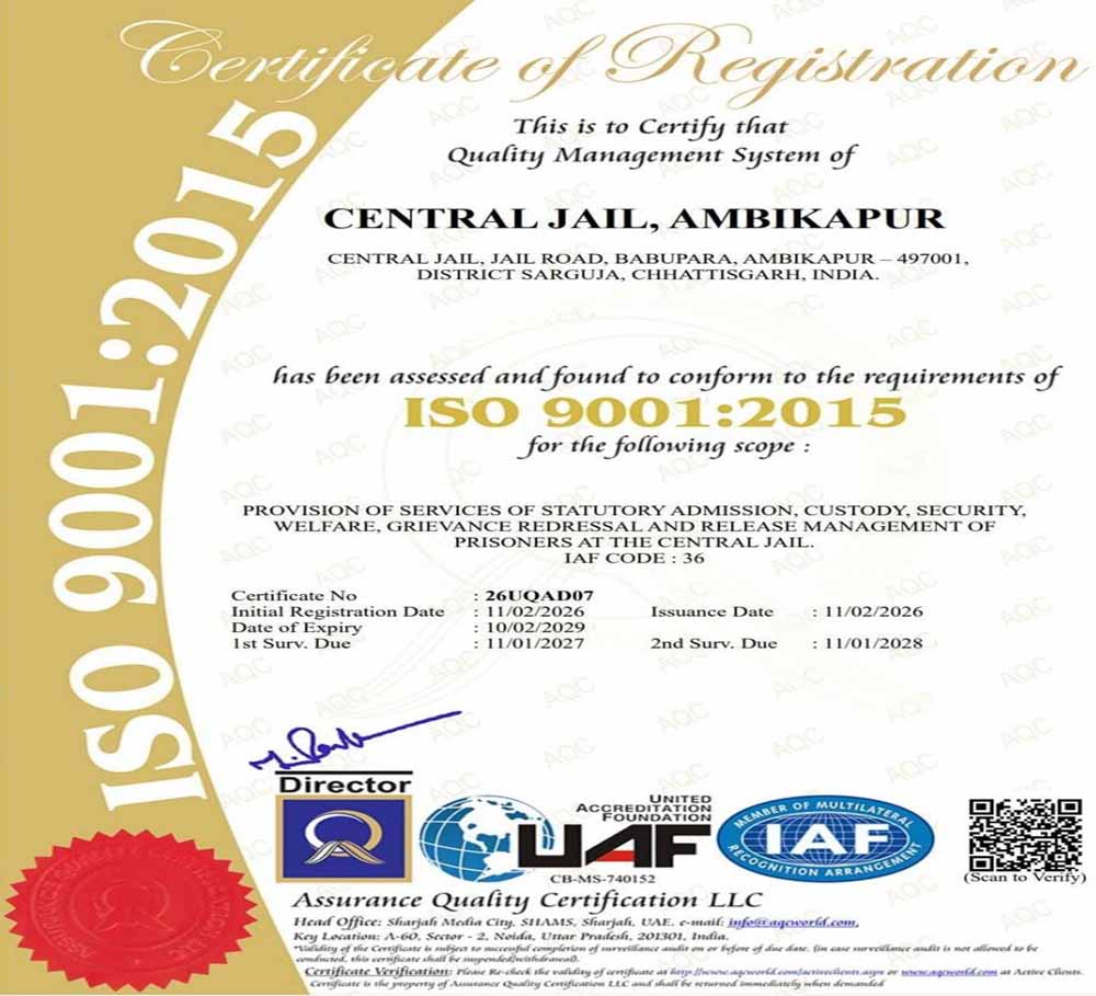 छत्तीसगढ़ की जेल व्यवस्थाओं में गुणवत्ता, पारदर्शिता और जवाबदेही को सुदृढ़ करने की दिशा में एक महत्वपूर्ण उपलब्धि हासिल हुई है। उप मुख्यमंत्री एवं जेल विभाग के प्रभारी मंत्री विजय शर्मा के निर्देशन में राज्य की जेलों की व्यवस्थाओं को बेहतर बनाने के लिए लगातार प्रयास किए जा रहे है। इन्हीं प्रयासों का ही यह परिणाम है कि छत्तीसगढ़ की सेंट्रल जेल रायपुर, दुर्ग, बिलासपुर एवं अम्बिकापुर को अंतरराष्ट्रीय गुणवत्ता मानक आईएसओ 9001ः2015 का प्रमाणन प्राप्त हुआ है।