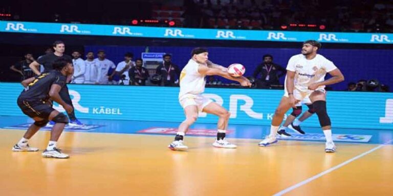 आरआर केबल प्राइम वॉलीबॉल लीग पावर्ड बाय स्कैपिया मुकाबले में अहमदाबाद डिफेंडर्स ने गत चैंपियन कालीकट हीरोज को 12-15, 15-12, 15-12, 16-14 से हरा दिया। बत्तूर बत्सुरी को प्लेयर ऑफ द मैच चुना गया। आज यहां गाचीबोवली इंडोर स्टेडियम में खेले गए मैच में अशोक बिश्नोई और शमीमुद्दीन ने शुरुआत में ही अंगमुथु के आक्रमण का मुकाबला करने के लिए टू-मैन ब्लॉक लाइन बनाई। डिफेंडर्स की बैक लाइन ने कालीकट के अटैक्स से निपटने के लिए अपने पास शानदार ढंग से वितरित किए। शॉन टी जॉन की अनुपस्थिति में, बत्सुरी ने अहमदाबाद के लिए प्रमुख आक्रामक भूमिका निभाई और अपनी टीम को एक शानदार प्रदर्शन करने में मदद की।