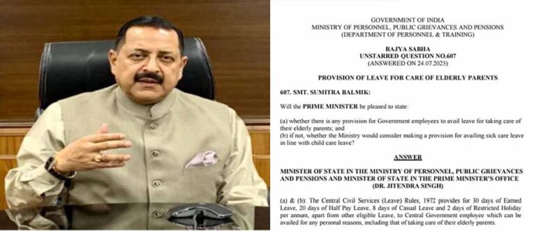 केंद्रीय मंत्री जितेन्द्र सिंह ने राज्यसभा में एक सवाल के जवाब में बताया कि केंद्रीय सिविल सेवा (छुट्टी) नियम, 1972 में अन्य पात्र छुट्टियों के अलावा, केंद्र सरकार के कर्मचारियों को प्रति वर्ष 30 दिन की अर्जित छुट्टी, 20 दिन की आधे वेतन की छुट्टी, 8 दिन की आकस्मिक छुट्टी और 2 दिन की प्रतिबंधित छुट्टी का प्रावधान है। इसका लाभ वे अपने बुजुर्ग माता-पिता की देखभाल सहित किसी भी व्यक्तिगत कारणों से उठा सकते हैं।