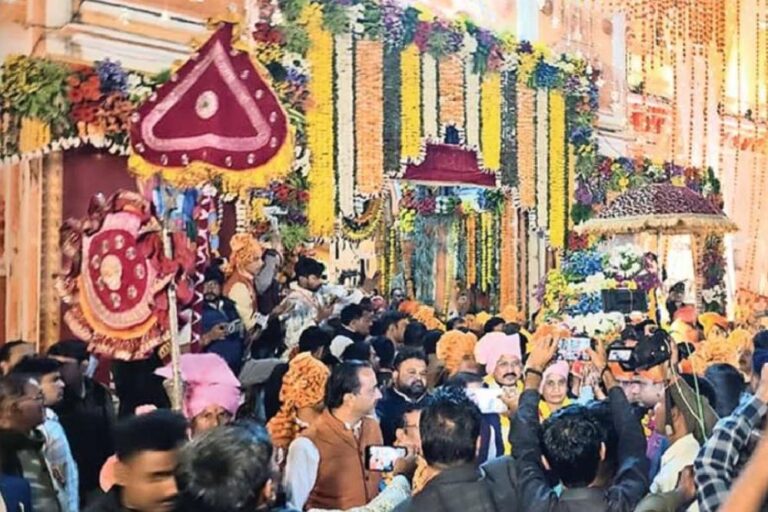 शिखर पर धर्मध्वज फहराने के साथ मंगलवार को अयोध्या में राम जन्मभूमि (Ayodhya Ram Mandir) के मंदिर की पूर्णत: का उल्लास बुंदेलखंड की अयोध्या कहे जाने वाले मध्य प्रदेश के ओरछा स्थित श्रीराम राजा सरकार की बरात में भी दिखा। यहां खजरी का मुकुट लगाकर ठेठ बुंदेली अंदाज में निकले श्रीराम राजा सरकार को निहारने के लिए दूर-दराज से पहुंचे श्रद्धालुओं की भीड़ आतुर दिखी।