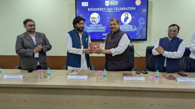 रायपुर (mediasaheb.com)| मैट्स स्कूल ऑफ इंजीनियरिंग एवं इंफॉर्मेशन टेक्नोलॉजी ने इंजीनियर्स डे 2025 को बड़े उत्साह और गरिमा के साथ मनाया। यह आयोजन भारत रत्न सर मोक्षगुंडम विश्वेश्वरैया की जयंती को समर्पित था, जो एक महान अभियंता और राष्ट्र निर्माता रहे हैं, जिनके दूरदर्शी योगदान आज भी पीढ़ियों को प्रेरित करते हैं। कार्यक्रम के दौरान प्रत्येक विभाग द्वारा अभिनव प्रोजेक्ट प्रदर्शित किए गए, जिनमें सस्टेनेबल सॉल्यूशन्स, ग्रीन एनर्जी और अत्याधुनिक तकनीकी अवधारणाएँ शामिल थीं, जो विश्वविद्यालय की अनुसंधान, रचनात्मकता और उद्योग-उन्मुख कौशल के प्रति प्रतिबद्धता को दर्शाती हैं।