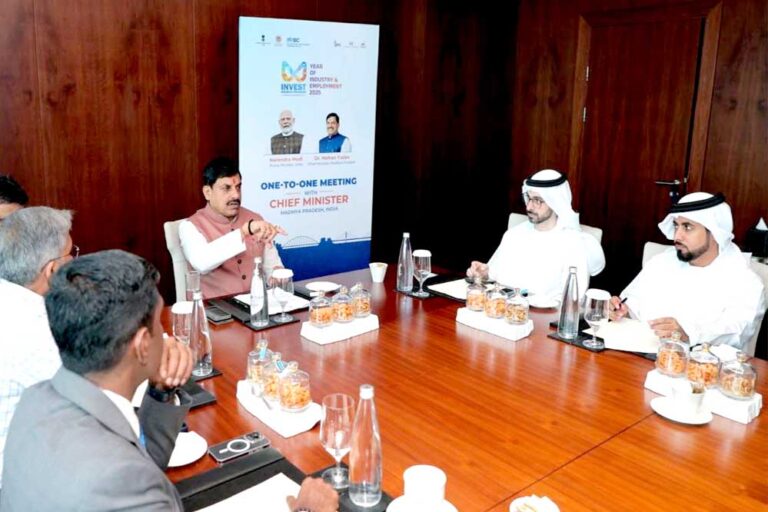 मुख्यमंत्री डॉ. मोहन यादव ने दुबई यात्रा के तीसरे दिन डीपी वर्ल्ड और जेबेल अली फ्री ज़ोन (JAFZA) के वरिष्ठ अधिकारियों से भेंट कर “भारत मार्ट” परियोजना और उससे जुड़ी लॉजिस्टिक्स संभावनाओं पर विस्तार से चर्चा की। यह बैठक भारत के सूक्ष्म, लघु और मध्यम उद्यमों (MSMEs) को वैश्विक बाज़ार से जोड़ने की दिशा में एक ऐतिहासिक पहल मानी जा रही है।