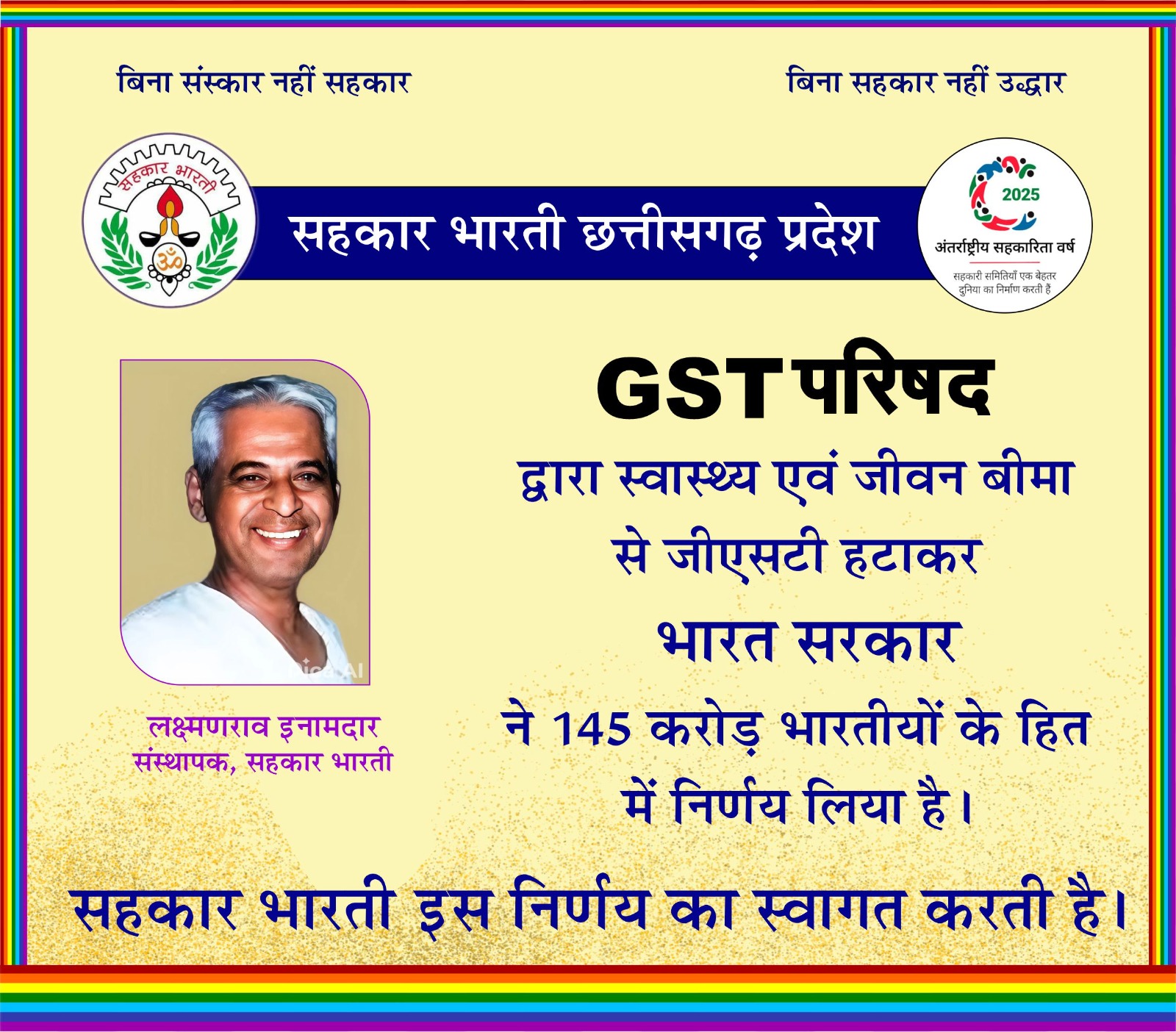 जीवन एवं स्वास्थ्य बीमा सेवाओं में छूट के कारण नागरिकों के जीवन स्तर में सुधार होगा। विशेषकर निम्न और मध्यम वर्ग को सामाजिक सुरक्षा प्राप्त करने का सुनहरा अवसर मिलेगा । पुनः, सहकार भारती केंद्र सरकार तथा GST Council को इस ऐतिहासिक निर्णय हेतु विशेष रूप से अभिनंदन करती है। धन्यवाद ।