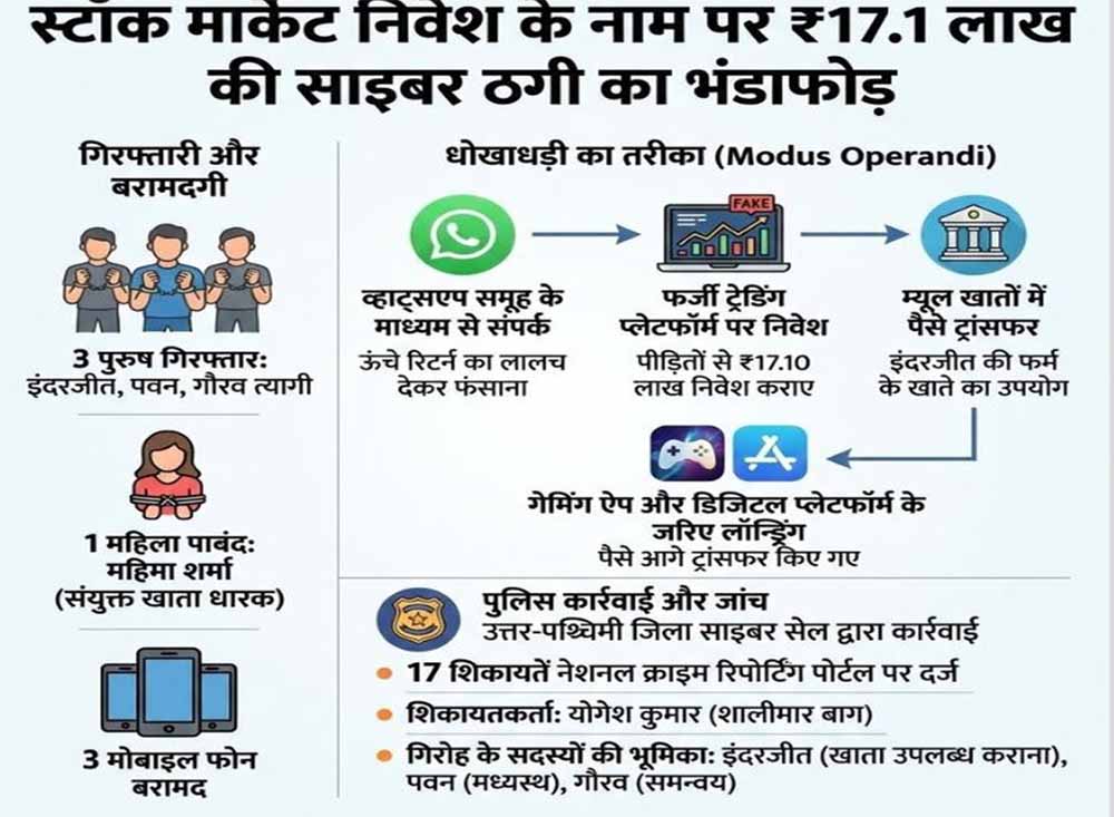 स्टॉक मार्केट निवेश के नाम पर 17.1 लाख रुपये की ठगी करने वाले तीन आरोपितों को उत्तर-पश्चिमी जिला साइबर सेल ने गिरफ्तार किया है। वहीं, इस मामले में एक महिला आरोपित को पाबंद किया है। इनके कब्जे से अपराध में इस्तेमाल तीन मोबाइल फोन बरामद किए गए हैं।