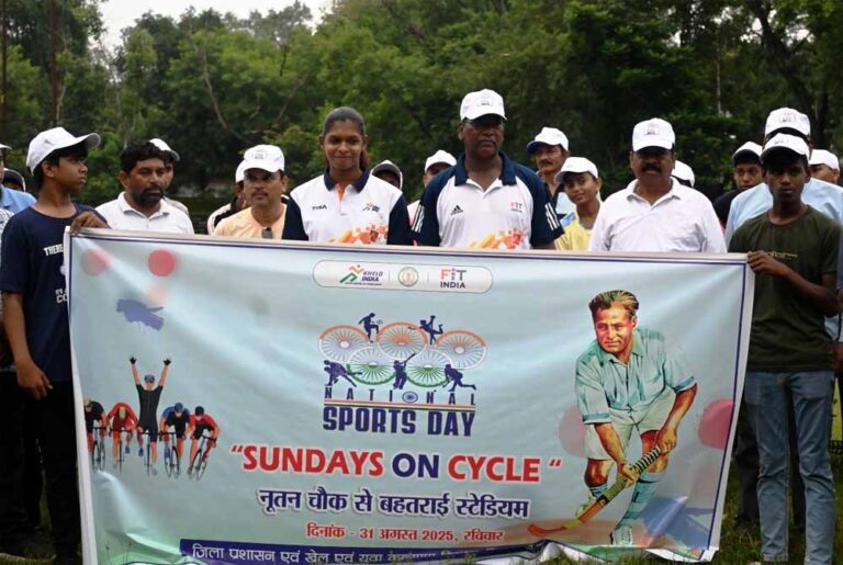 राष्ट्रीय खेल दिवस के तहत आज बिलासपुर में स्कूली छात्र-छात्राओं और 300 से अधिक खिलाड़ियों ने साइकल रैली निकाली। भारत सरकार के फिट इंडिया कार्यक्रम "सन्डेस ऑन सायकल" (Sundays on Cycle) के तहत पीएमश्री स्वामी आत्मांनद विद्यालय नूतन चौक सरकंडा से स्वर्गीय बी.आर. यादव राज्य खेल प्रशिक्षण केन्द्र बहतराई तक यह रैली निकाली गई। पूर्व ओलम्पियन एवं हॉकी के हेड कोच श्री अजीत इमानुएल लकड़ा और अंतरराष्ट्रीय कबड्डी खिलाडी संजू देवी ने हरी झंडी दिखाकर रैली को रवाना किया।