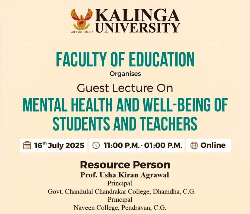 रायपुर (mediasaheb.com)| कलिंगा विश्वविद्यालय के शिक्षा संकाय ने 16 जुलाई 2025 को “छात्रों और शिक्षकों के मानसिक स्वास्थ्य और कल्याण” पर एक अतिथि व्याख्यान का सफलतापूर्वक आयोजन किया। यह कार्यक्रम शिक्षा संकाय की डीन डॉ. श्रद्धा वर्मा और शिक्षा संकाय की सहायक प्रोफेसर डॉ. सरोज नैयर के नेतृत्व में आयोजित किया गया, जिन्होंने सत्र की योजना बनाने और समन्वय करने में महत्वपूर्ण भूमिका निभाई।