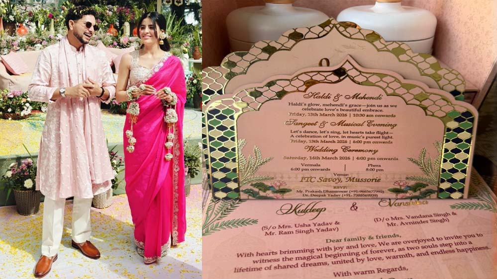 कल 'वंशिका' के होंगे कुलदीप: कुलदीप अपनी बचपन की दोस्त वंशिका के साथ 14 मार्च को सात फेरे लेंगे। शनिवार को होने वाले मुख्य समारोह में रोहित शर्मा, सूर्यकुमार यादव और हेड कोच गौतम गंभीर के पहुंचने की भी उम्मीद है। शादी के डिजिटल कार्ड को काफी मॉडर्न और रॉयल लुक दिया गया है। इसमें कपल ने अपनी जोड़ी को #Kulvansh नाम दिया है। 14 मार्च की शाम 5 बजे कुलदीप की बारात निकलेगी और शाही अंदाज में यह विवाह संपन्न होगा।
