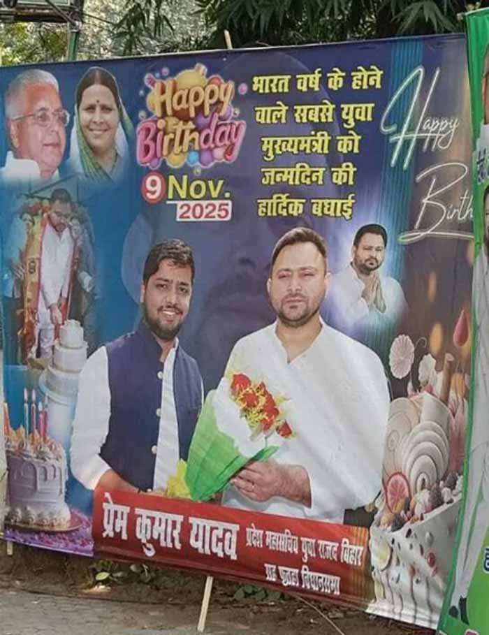 बिहार के नेता प्रतिपक्ष तेजस्वी यादव का कल 9 नवम्बर को जन्मदिन है। चुनावी साल में राष्ट्रीय जनता दल इसे खास बनाने की तैयारी पहले से ही कर रही है। तेजस्वी के जन्मदिन को लेकर पटना में बड़े बड़े पोस्टर लगाए गए हैं। पोस्टर में तेजस्वी यादव को बेहद खास गिफ्ट ऑफर किया गया है। बिहार महागठबंधन तेजस्वी यादव को अपना सीएम फेस घोषित कर चुका है।