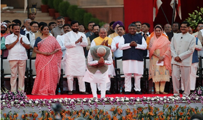 नई दिल्ली, (mediasaheb.com ) राष्ट्रपति रामनाथ कोविंद ने गुरुवार शाम को राष्ट्रपति भवन के प्रांगण में प्रधानमंत्री नरेन्द्र मोदी और उनके मंत्री परिषद के सदस्यों को पद एवं गोपनियता की शपथ दिलाई। लगभग दो घंटे चले शपथ ग्रहण समारोह के दौरान 25 केन्द्रीय मंत्री, नौ राज्यमंत्री(स्वतंत्र प्रभार) और 24 ने राज्यमंत्री के तौर पर शपथ ली। इसमें 46 मंत्रियों ने हिन्दी में तो 12 मंत्रियों ने अंग्रेजी में शपथ ग्रहण किया। कुछ शपथ लेने वाले मंत्रियों में 19 नये चेहरे रहे, जिसमें छह नये चेहरे कैबिनेट मंत्री बने।