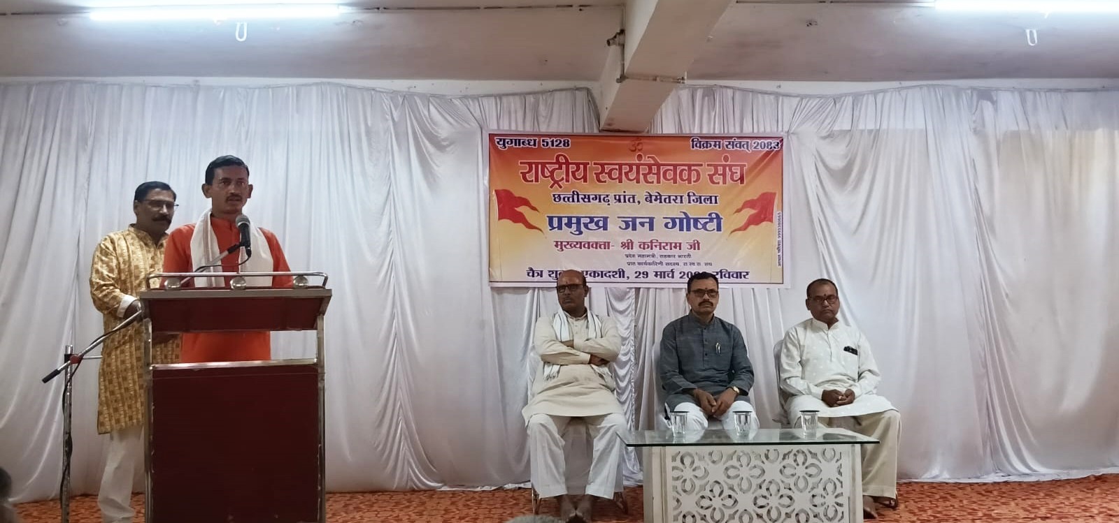 बेमेतरा (mediasaheb.com | । रविवार 29 मार्च को राष्ट्रीय स्वयंसेवक संघ की जिला ईकाई द्वारा आयोजित प्रमुख जन गोष्ठी में मुख्यवक्ता सहकार भारती के प्रदेश महामंत्री व राष्ट्रीय स्वयंसेवक संघ के प्रान्त कार्यकारिणी सदस्य श्री कनिराम जी ने कहा कि, संघ का कार्य भारत की श्रेष्ठ सांस्कृतिक परम्पराओं का संरक्षण करना हैं। संघ की कार्यपद्धति शास्त्रशुद्ध समाज आधारित हैं। संघ की शाखा में कोई भी आ सकता है। संघ की शाखा में सभी आयुवर्ग के व्यक्तियों के लिए अलग अलग कार्यक्रमों की रचना की गई हैं। संघ शाखा की विलक्षण कार्यपद्धति के कारण शाखा में नित्य आनेवाले सामान्य स्वयंसेवक के द्वारा सभी समाज को साथ में लेकर समाज में असामान्य कार्य होने लगते है, जिसकी कल्पना भी उसे नहीं होती।