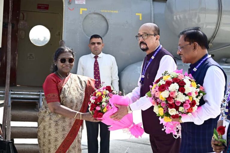 Share WhatsApp Facebook Twitter Email रायपुर, राष्ट्रपतिद्रौपदी मुर्मु के अंबिकापुर आगमन पर गांधी स्टेडियम हेलीपेड में राज्यपाल रमेन डेका ने पुष्पगुच्छ भेंट कर उनका आत्मीय स्वागत किया। इस अवसर पर मुख्यमंत्री विष्णुदेव साय भी उपस्थित थे। Ambikapur President Murmu