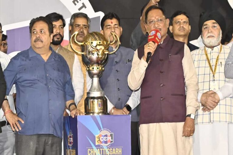 मुख्यमंत्री विष्णु देव साय आज यहां नवा रायपुर के शहीद वीरनारायण सिंह अंतर्राष्ट्रीय क्रिकेट स्टेडियम में आयोजित छत्तीसगढ़ क्रिकेट प्रीमियर लीग सीजन 2 के समापन समारोह में शामिल हुए। मुख्यमंत्री साय ने छत्तीसगढ़ क्रिकेट प्रीमियर लीग की विजेता टीमों को विनर्स कप सौंपा। बारिश की वजह से सीसीपीएल का फाइनल मैच नहीं खेला जा सका। फाइनल में पहुंची दोनों टीमों रायपुर राइनोस और राजनांदगांव पैंथर्स को संयुक्त विजेता घोषित किया गया।