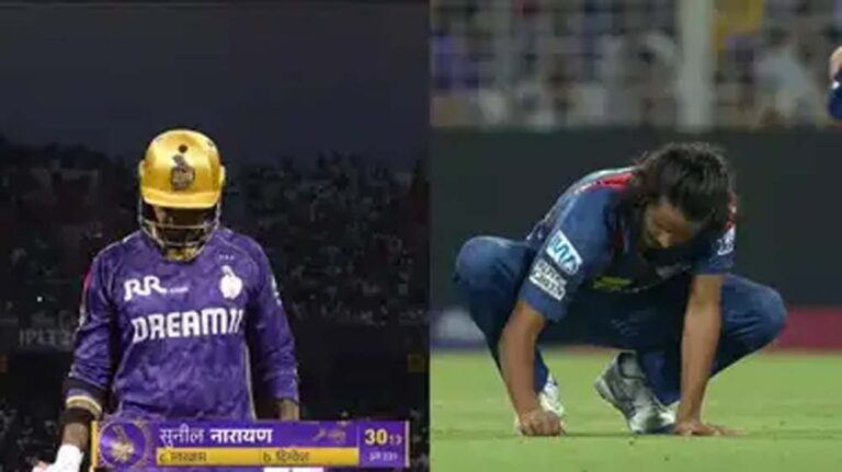 239 रनों के लक्ष्य का पीछा करते हुए केकेआर ने तेज शुरुआत की। नरेन क्विंटन डिकॉक (9 गेंदों में 15) संग पहले विकेट के लिए 37 रन जोडे़। डिकॉक को आकाशदीप ने तीसरे ओवर में आउट किया। इसके बाद, नरेन ने कप्तान अजिंक्य रहाणे (35 गेंदों में 61) के साथ मोर्चा संभाला और और पावरप्ले में धूम-घड़ाका जारी रखा। ऐसे में एलएसजी कैप्टन ऋषभ पंत ने सातवें ओवर में 25 वर्षीय राठी को गेंद थमाई। उन्होंने ओवर की दूसरी गेंद ऑफ स्टंप के बाहर डाली, जिसपर नरेन ने लॉन्ग ऑफ की दिशा में हवाई फायर किया। डेविड मिलर ने नरेन का आसान कैच लपका। उन्होंने 13 गेंदों का सामना करने के बाद चार चौके और दो छक्के लगाए।