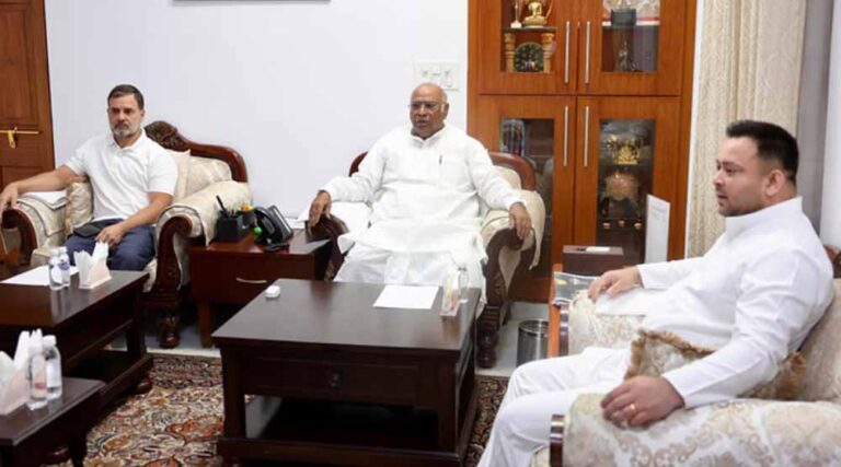 बिहार में विधानसभा चुनाव को लेकर बैठकों का दौर जारी है। तीन दिन पहले पटना में राष्ट्रीय जनतांत्रिक गठबंधन (एनडीए) की बैठक हुई। सोमवार को दरभंगा में एनडीए के सभी प्रमुख नेता एकजुट हुए थे। आज दिल्ली में राष्ट्रीय जनता दल और कांग्रेस के बीच बैठक हो रही है। इसमें सीट शेयरिंग समेत कई मुद्दों पर बातचीत हो रही। नेता प्रतिपक्ष और लालू प्रसाद के छोटे बेटे तेजस्वी यादव दिल्ली में कांग्रेस के राष्ट्रीय अध्यक्ष मल्लिकार्जुन खरगे और राहुल गांधी से बातचीत कर रहे हैं। तेजस्वी यादव के साथ राजद के वरीय नेता भी मौजूद हैं।