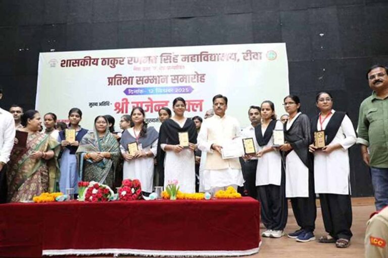 उप मुख्यमंत्री श्री राजेन्द्र शुक्ल ने ठाकुर रणमत सिंह महाविद्यालय रीवा में मेरिट सूची में स्थान प्राप्त करने वाले विद्यार्थियों को सम्मानित किया। उप मुख्यमंत्री श्री शुक्ल ने कहा कि प्रतिभाशाली युवा ही देश की सच्ची पूंजी हैं। परिश्रम और लगन से ही सफलता का मार्ग प्रशस्त होता है। मेरिट में स्थान प्राप्त करके सम्मानित होने वाले विद्यार्थियों की सफलता के पीछे उनकी प्रतिभा और परिश्रम की कठिन साधना है। विद्यार्थी संस्कारयुक्त शिक्षा और ऊंचे लक्ष्य प्राप्त कर प्रदेश और देश का गौरव बढ़ाएं। जो विद्यार्थी मेरिट सूची में स्थान नहीं बना सके वे पुन: अधिक मेहनत के साथ प्रयास करें। असफलता से मिली सीख ही हमें सफलता की राह दिखाती है। उन्होंने कहा कि शिक्षा तभी सम्पूर्ण होगी जब उसमें सांस्कृतिक मूल्यों और अच्छे संस्कारों का समावेश हो।