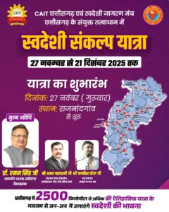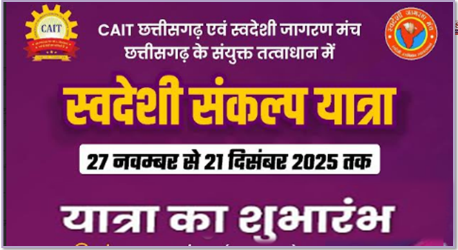 रायपुर (mediasaheb.com)| कन्फेडरेशन ऑफ ऑल इंडिया ट्रेडर्स (CAIT) एवं स्वदेशी जागरण मंच के संयुक्त तत्वावधान में पूरे देश में संचालित स्वदेशी संकल्प यात्रा 27 नवम्बर 2025 को छत्तीसगढ़ में प्रवेश करेगी। स्वदेशी, आत्मनिर्भर भारत एवं वोकल फॉर लोकल के संदेश को जन-जन तक पहुँचाने के उद्देश्य से निकली यह यात्रा प्रदेश में व्यापारी समुदाय और स्थानीय उद्योगों के लिए ऊर्जा एवं उत्साह का नया संचार करेगी।