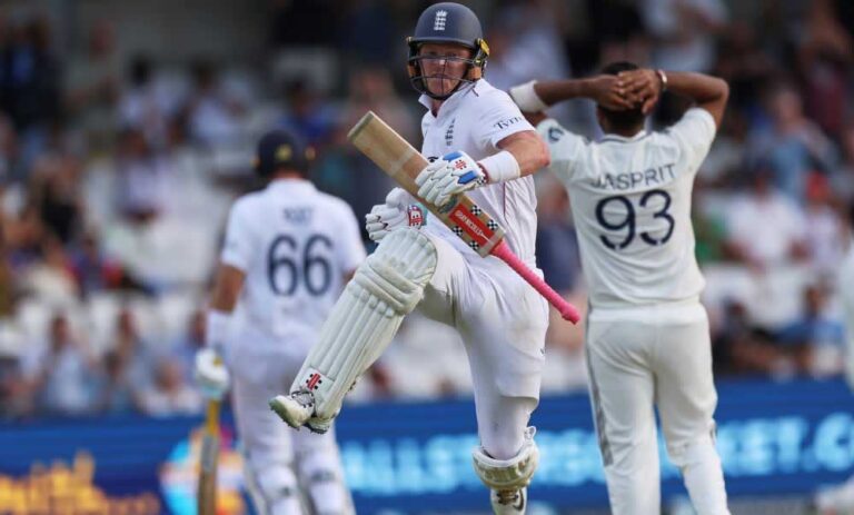 इंग्लैंड की पहली पारी बारिश के कारण देरी से शुरू हुई. जसप्रीत बुमराह ने पहले ही ओवर में आउटस्विंगर पर जैक क्रॉली का विकेट लिया. करुण नायर ने उन्हें पहली स्लिप में कैच आउट किया. इसके बाद ओली पोप और बेन डकेट की जोड़ी क्रीज पर टिकी रही. इस बीच भारतीय फील्डर्स ने कई कैच भी छोड़े. डकेट ने चाय से पहले अपना अर्धशतक पूरा किया और पोप ने इसके तुरंत बाद अपना अर्धशतक पूरा किया. 29वें ओवर में बुमराह ने डकेट को आउट कर 122 रन की साझेदारी तोड़ी.