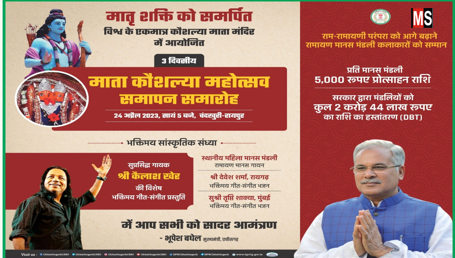 माता कौशल्या महोत्सव के समापन अवसर पर अध्यक्ष के तौर पर संस्कृति मंत्री श्री अमरजीत भगत, विशिष्ट अथिति के रूप में गृह एवं पर्यटन मंत्री श्री ताम्रध्वज साहू, कृषि मंत्री श्री रविन्द्र चौबे तथा नगरीय प्रशासन मंत्री डॉ शिव कुमार डहरिया उपस्थित रहेंगे।