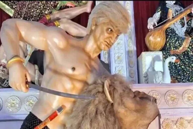 इस पंडाल समिति ने मां दुर्गा के साथ किसी राक्षसी रूप के महिषासुर की नहीं बल्कि ट्रंप की महिषासुर वाली मूर्ति लगाई है, जो काफी वायरल हो रही है। बहरामपुर में खागड़ा क्रेमेटोरियम घाट दुर्गा पूजा समिति ने यह महिषासुर ट्रंप की मूर्ति लगाई है। समिति ने बताया कि ट्रंप ने भारत को धोखा दिया इसलिए उनकी ऐसी मूर्ति लगाई गई है। समिति ने कहा, वह भारत पर लगे 50 प्रतिशत टैरिफ को एक धोखा मानते है। उन्होंने कहा कि, पीएम मोदी ट्रंप को अपना दोस्त मानते थे लेकिन इसके बावजूद उन्होंने टैरिफ के रूप में भारत को धोखा दिया इसलिए यह मूर्ति लगाई गई है।