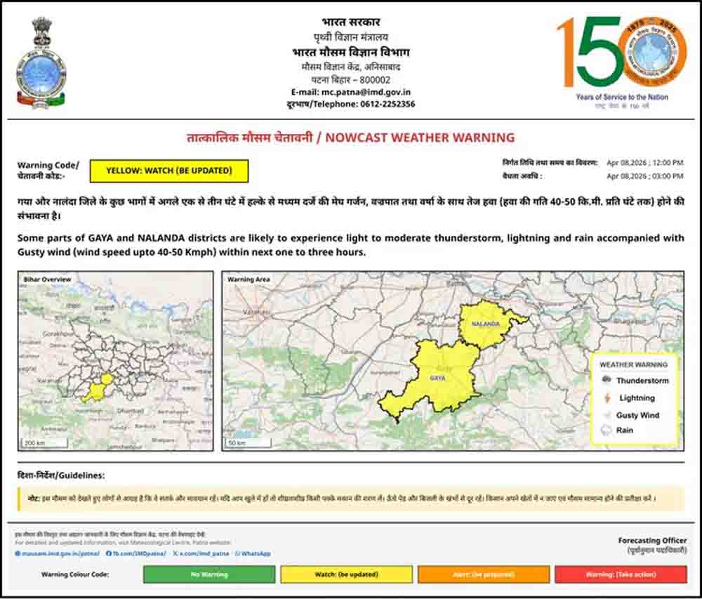 मौसम विभाग ने गयाजी और नालंदा जिले में अगले एक से तीन घंटे में बारिश की चेतावनी जारी की है. इस दौरान तेज बारिश के साथ 40 से 50 किलोमीटर प्रति घंटे की रफ्तार से हवा चल सकती है. इसके साथ ही ठनका गिरने की भी चेतावनी जारी की गई है. मौसम में बदलाव को देखते हुए लोगों से सावधान रहने की अपील की गई है. खासकर किसानों से बिगड़े मौसम में खेतों में नहीं रहने की अपील की है.